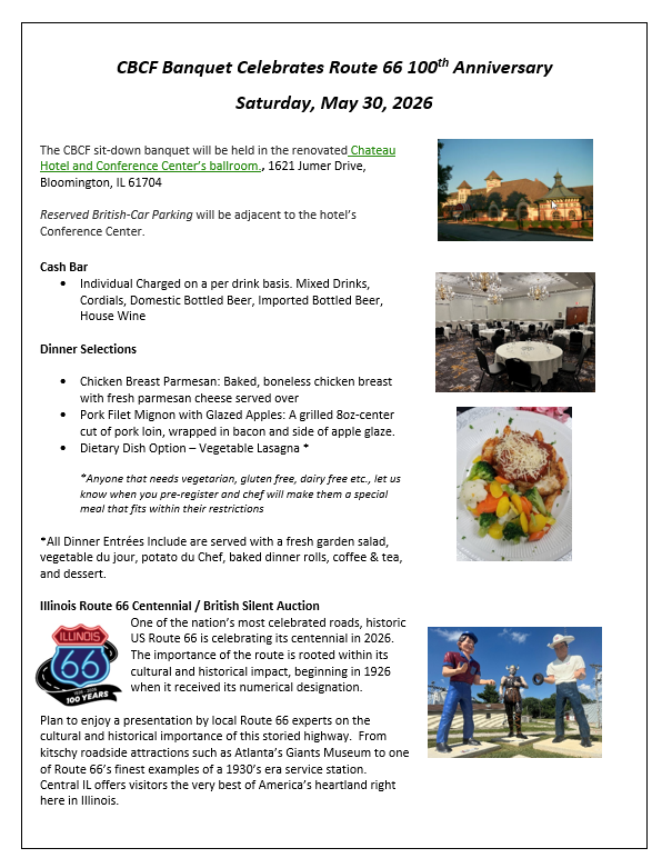 Banquet menu selections and car show classes can be downloaded below. Reviewing this information, before opening the registration form, may be helpful. Questions can be directed to the CBCF Registrar cbcfreg@gmail.com)
